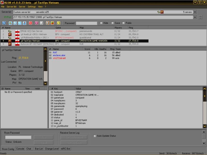 Ukazała się nowa wersja świetnego programu do monitorowania serwerów - HLSW. Program obsługuje większość popularnych gier sieciowych, jednak dla nas najważniejsze to obsługa Battlefield 1942, oraz od tej wersji Battlefield: Vietnam. Jest prosty i konfigurowalny, wyświetla statystykę serwera i graczy w czasie rzeczywistym przy znikomym użyciu łącza. Kto zna program, temu polecać nie trzeba... Nie sugerujcie się wersją "beta" - program jest ciągle rozwijany.